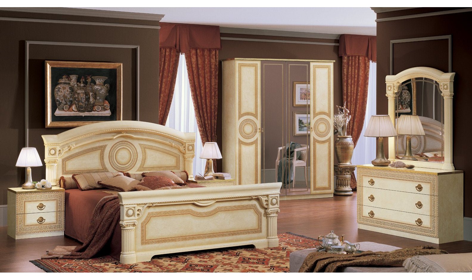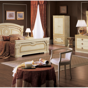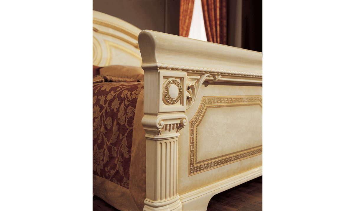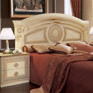 Presenting the classic Aida Bed in Ivory with Gold Trim, a perfect complement to your haven of a bedroom. This panel bedroom suite, which is expertly crafted with great attention to detail, effortlessly combines traditional European style with contemporary efficiency.