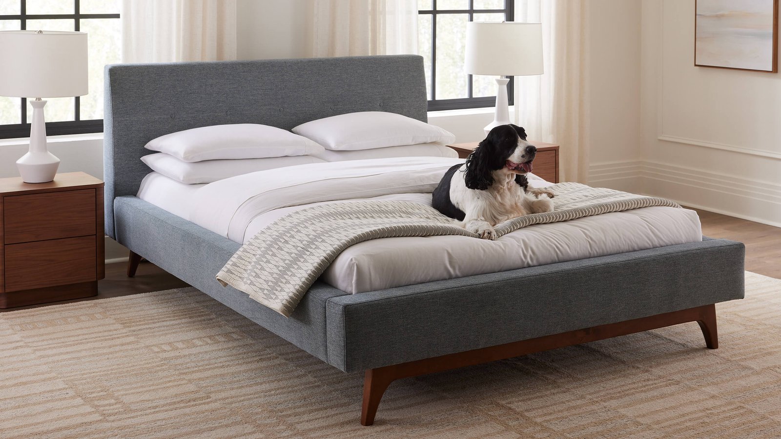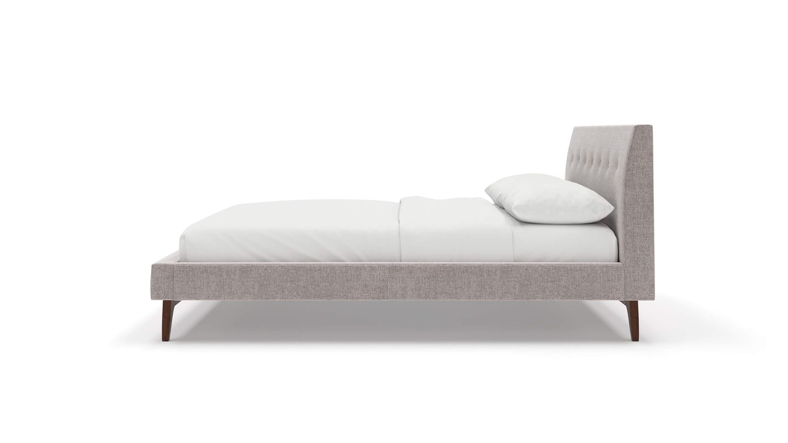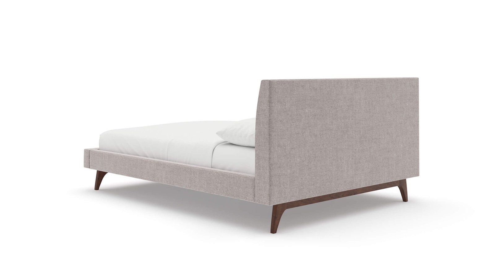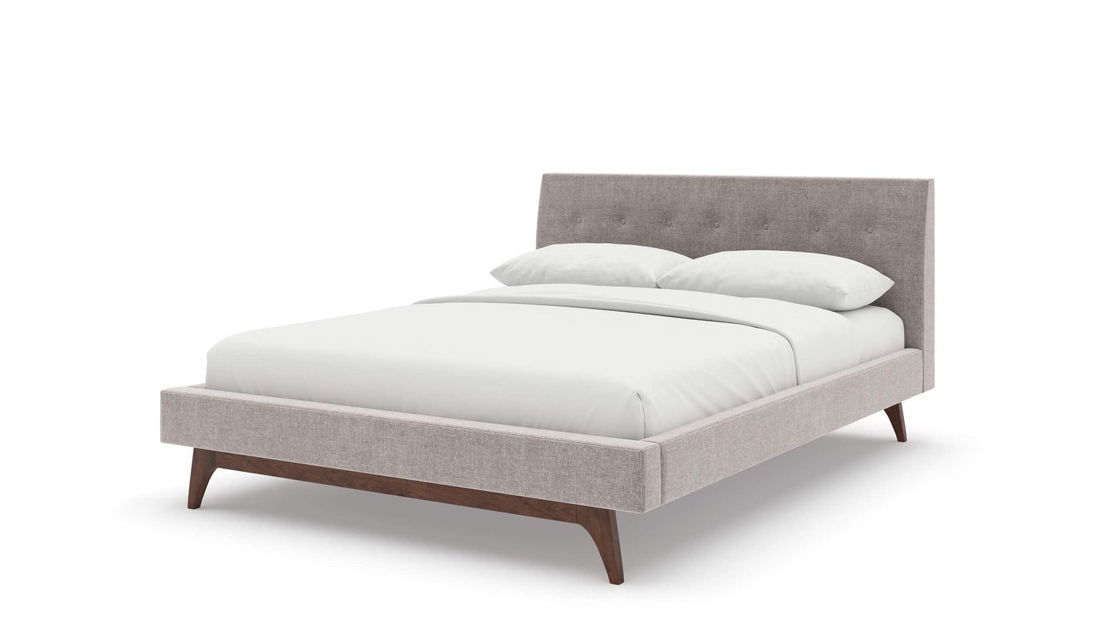 Built for dreaming, designed for style the Tyler Upholstered bed features an expertly button-tufted headrest and elevated upholstered footboard. Curved solid wood legs provide a glimpse into classic Danish modern design. The angled exposed wooden Tyler legs offer an uninterrupted flow that creates a visual lightness to the fully upholstered frame. The elevated mid-century design is customizable to suit your style with two headboard heights, three premium wood finishes, and over 125 fabric and leather upholstery options.